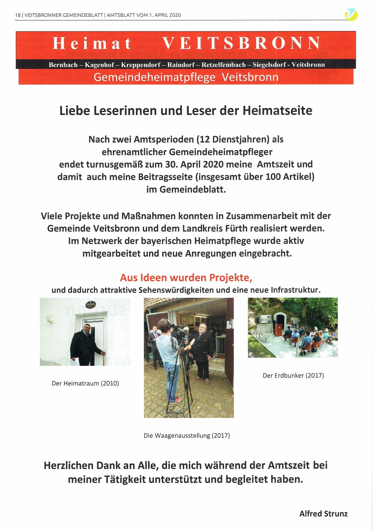 Gemeindeheimatpfleger beendet nach 2 Amtsperioden am 30.04.2020 seine Arbeit